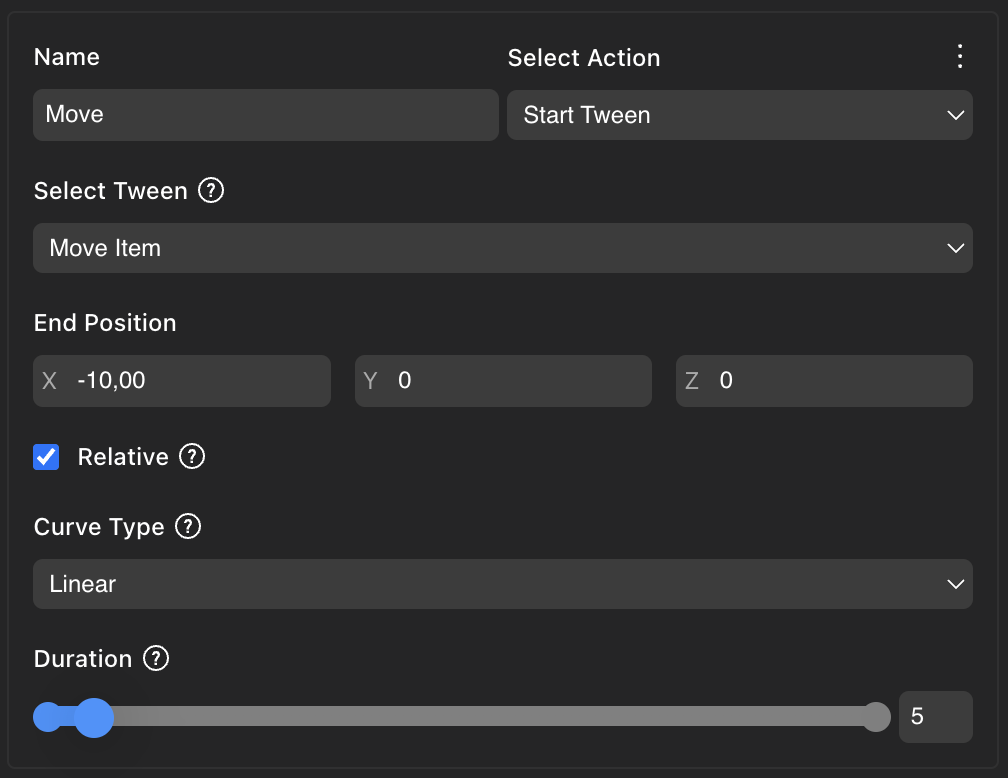 For example, use this to make a platform move continually. Use an On Spawn trigger to activate a tween action. Then use On State Change triggers to keep it moving between two or more positions.