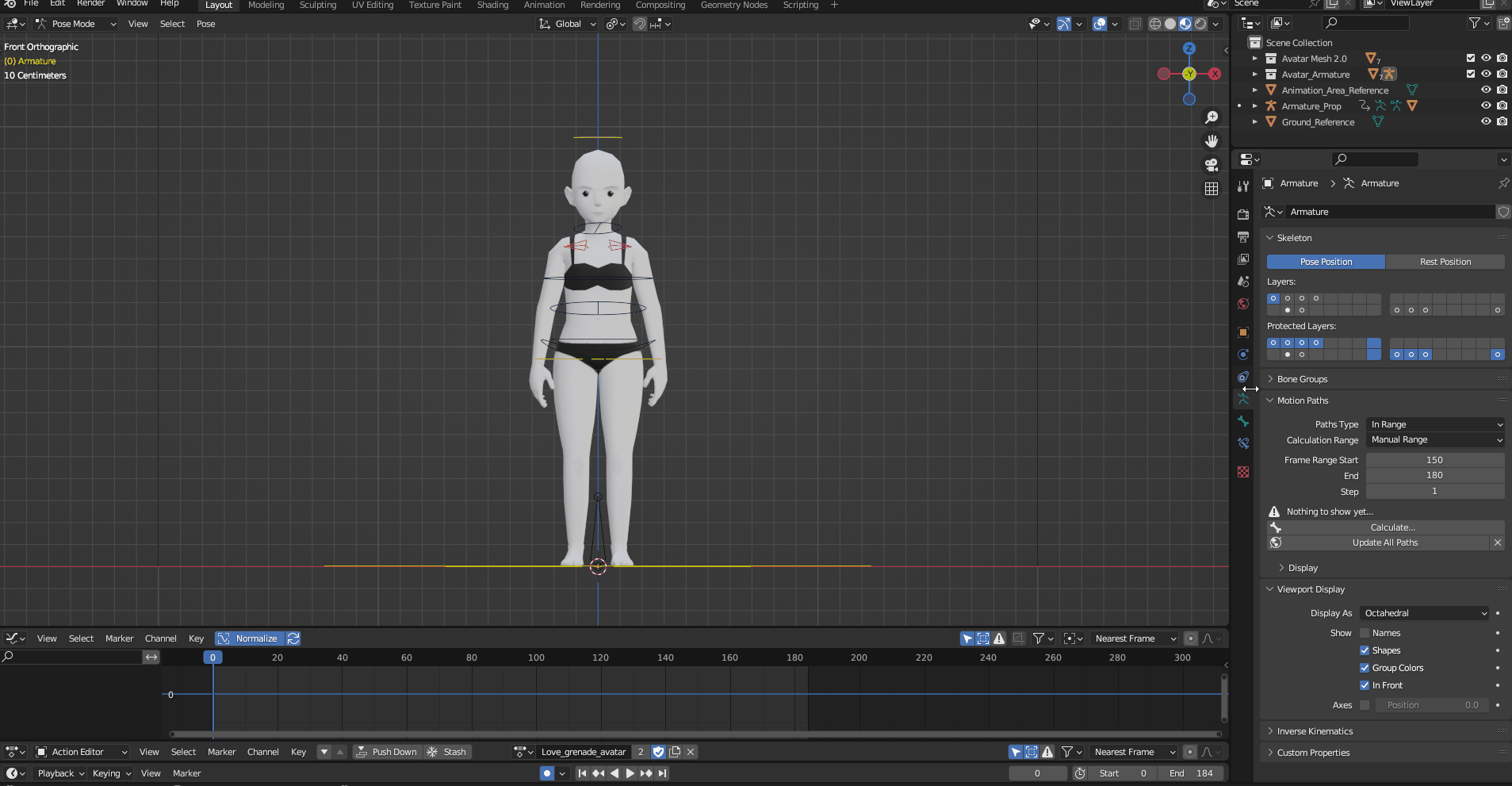 In the rig file provided, there’s already an action, the Starting_Pose. Considering that all avatar actions start from the idle pose, we really encourage starting your animation from that pose and also using it again in the last frame. This will make for a better transition from Idle to Emote and a more fluid animation.