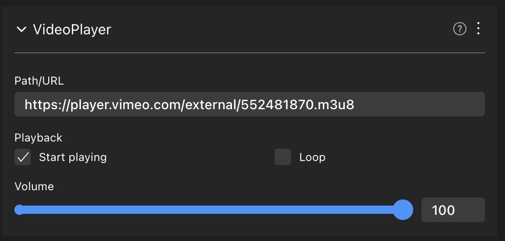 - Local files: Upload a video file as part of the scene, then point the URL field to the path to that file.