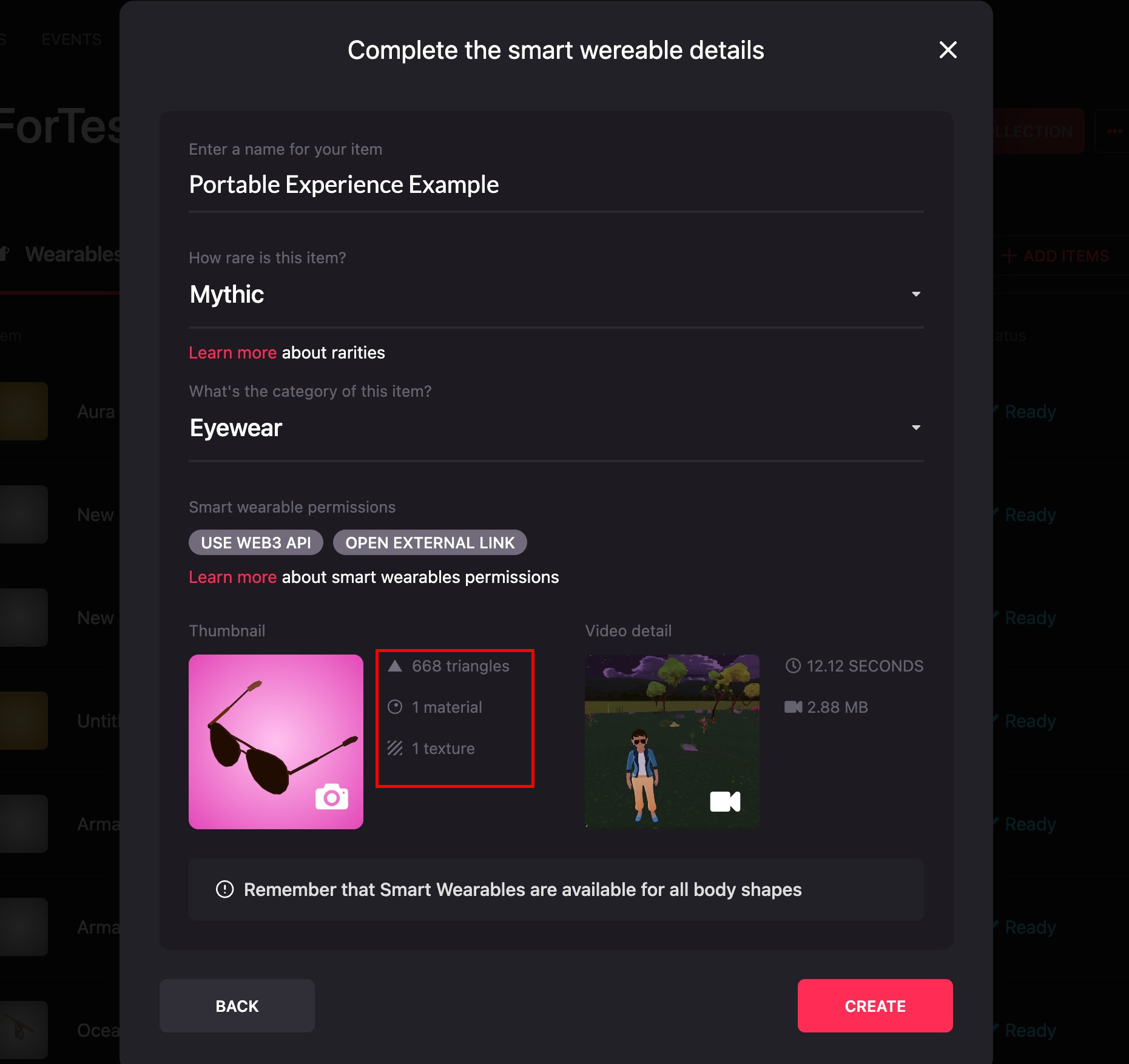 Next to the thumbnail, you’re going to find the properties of your wearable such as the number of triangles of your model, the number of materials, and the textures.