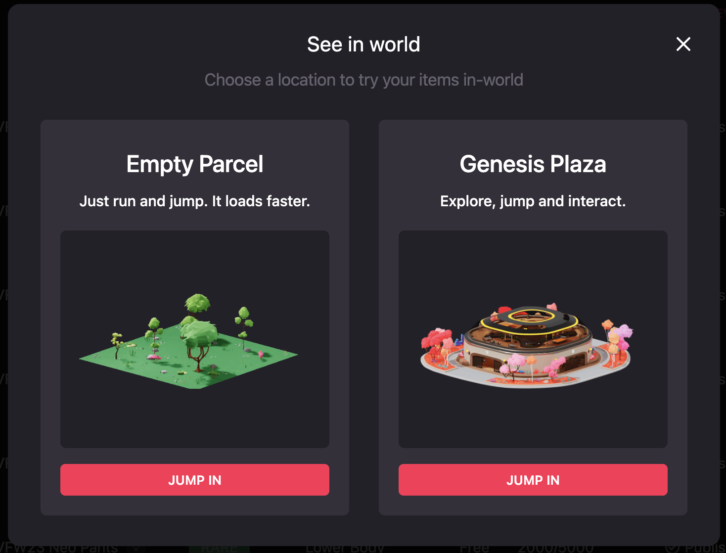 After clicking the See in Decentraland button, the following pop-up is going to appear. Selecting Empty Parcels will teleport you to a place without too much content, which will load faster. Selecting Genesis Plaza will take you to the main plaza.