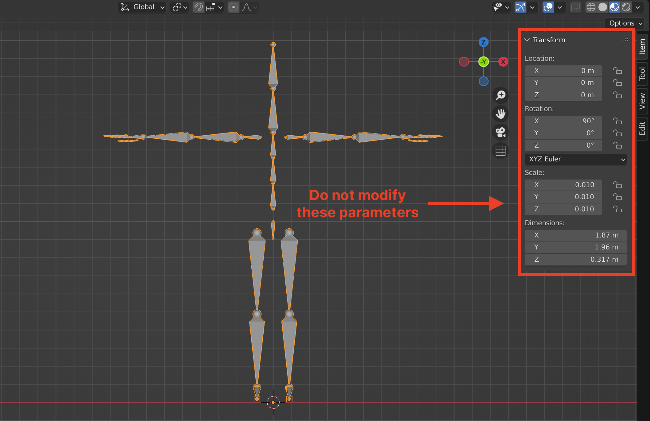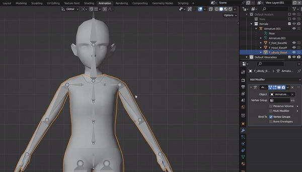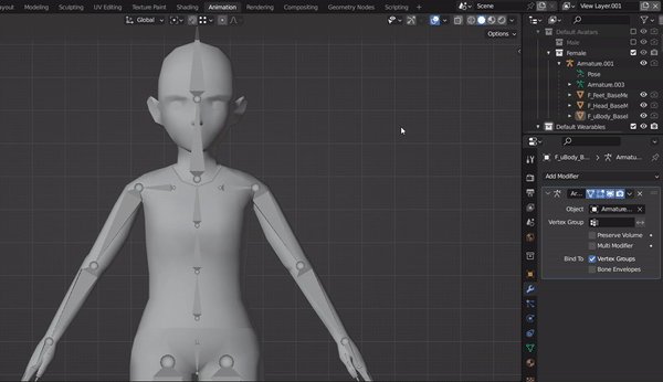 Remember not to change any of the specifications, naming conventions, hierarchy, or transforms of the given armature. Changing any of these will cause the wearable to stop working in the client after exporting.