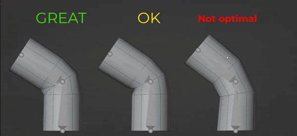 In order to get the best results on the wearable topology when it comes to joints (arms or legs, for example) it’s important to have good practices when creating loops. Here we can see the difference on the deformation of the mesh for different loop cuts: