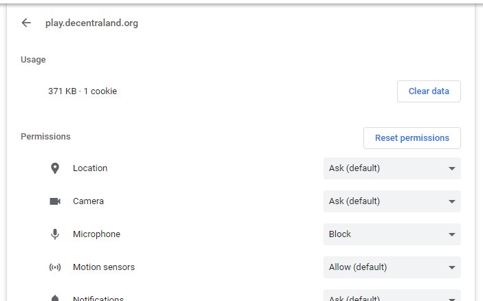 Another possible cause could be not having the microphone permissions allowed in your browser. This could happen in case you missed the permissions popup the first time the browser asked you for, or maybe you forgot to apply any action when the browser asked you. In any case, we can check this configuration again by opening our browser’s configuration: Settings → Privacy and Security → Site Settings and look for play.decentraland.org in Recent activity. You will see a list of permissions